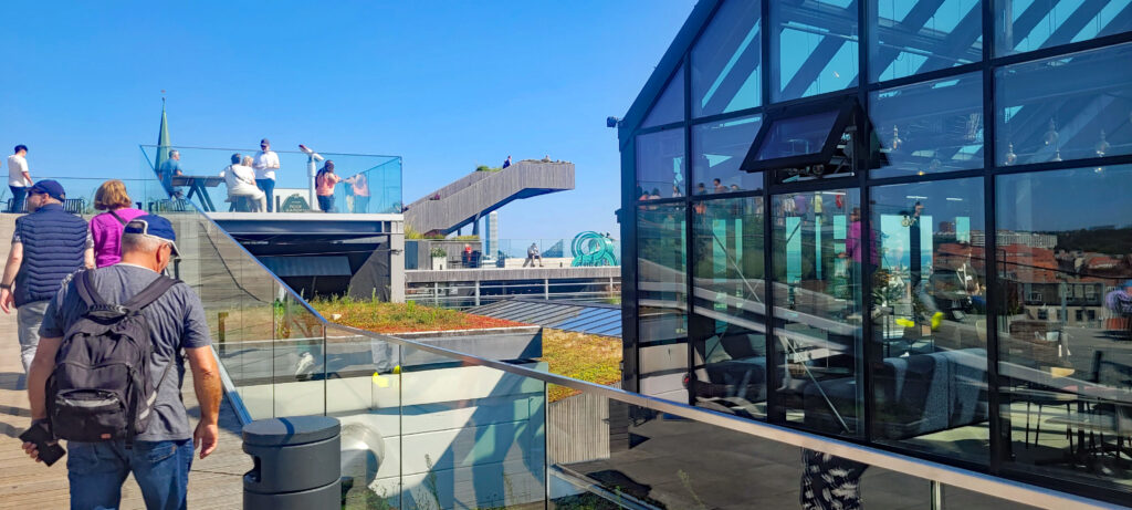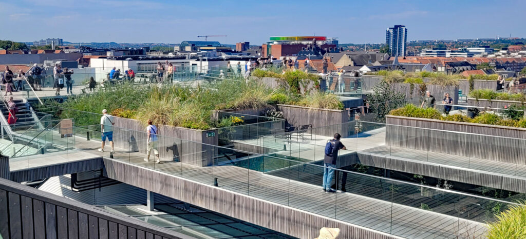 Es wird wohl daran liegen, dass der morgendliche Tee nicht ganz ausreicht, mich sicher auf die Beine zu stellen. Es muss noch ein Cappuccino her. Und den gibt es auf der Dachterrasse vom Kaufhaus Salling. Dachterrasse? Nein, es ist eine Dachlandschaft mit Wegen, Schrägen, Plattformen, Treppen und tollen Aussichtspunkten über die Stadt – dazwischen immer wieder dichte Bepflanzungen. Sowas hatten wir noch nie gesehen. Eine Attraktion