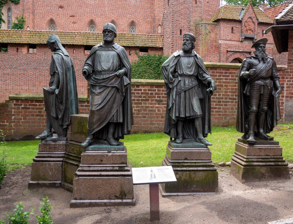 Dass die Burg eigentlich aus drei Teilen besteht, der Vorburg, dem Mittel- und dem Hochschloss, erfahren wir – wenn überhaupt – lediglich beiläufig. Auch, wofür diese Burgteile gedacht und genutzt wurden, bleibt im Schwall seiner Erklärungen reine Nebensache. Lediglich die Namen der verschiedenen Hochmeister und deren Lebensdaten kommen immer wieder zur Sprache (z.B. derer vom Foto: Hermann von Salza, Siegfried von Feuchtwangen, Winrich von Kniprode und Albrecht von Brandenburg – von links nach rechts). Aber was sie in der Burg gemacht haben und vor allem warum, geht zwischen architektonischen Hinweisen und dem ewigen „kommen Sie, hier entlang“ einfach unter. Außerdem ist es derart voll von Menschen, dass man kaum in der Lage ist, die Räume in ihrer Gesamtheit richtig zu erfassen. Mein Trost: Es geht mir nicht alleine so und draußen regnet es. Also: weiter.