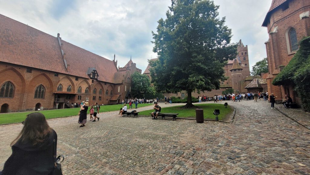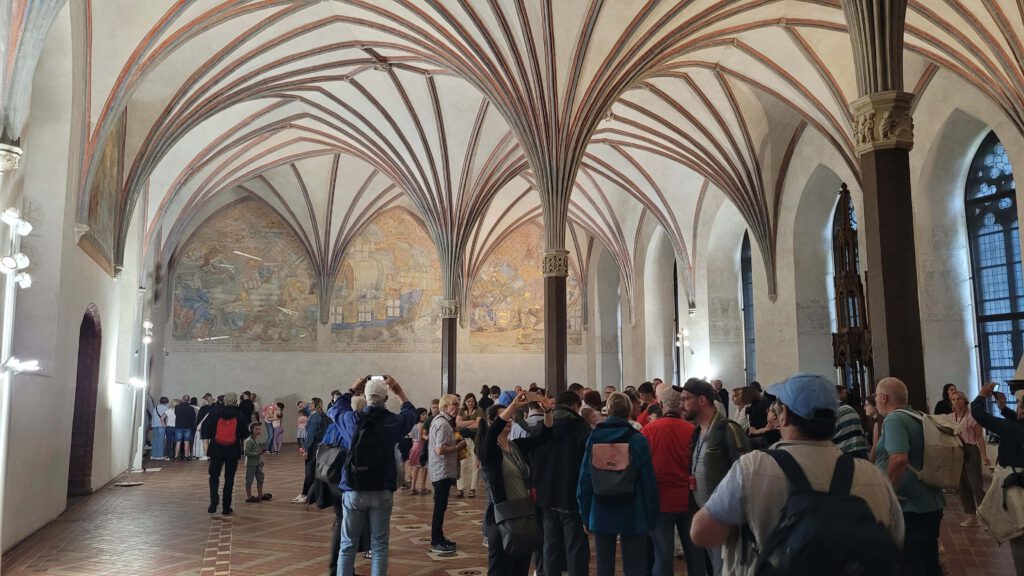 Und dieser Bau ist wirklich mächtig. Erbaut im 13. und 14. Jahrhundert ist es eine Stadt für sich. Zahlreiche Gebäude, verbunden durch Gänge, Wege, Höfe, gesichert mit Toren, Fallgittern, Zugbrücken und Pechnasen, beherbergen weite Hallen, Schlaf- Ess- und Versammlungssäle, in denen die Ritter des Deutschen Ordens – die Herren mit den weißen Kutten und dem schwarzen Kreuz im Schild – lebten und politisch, geistig, wie auch geistlich wirkten.