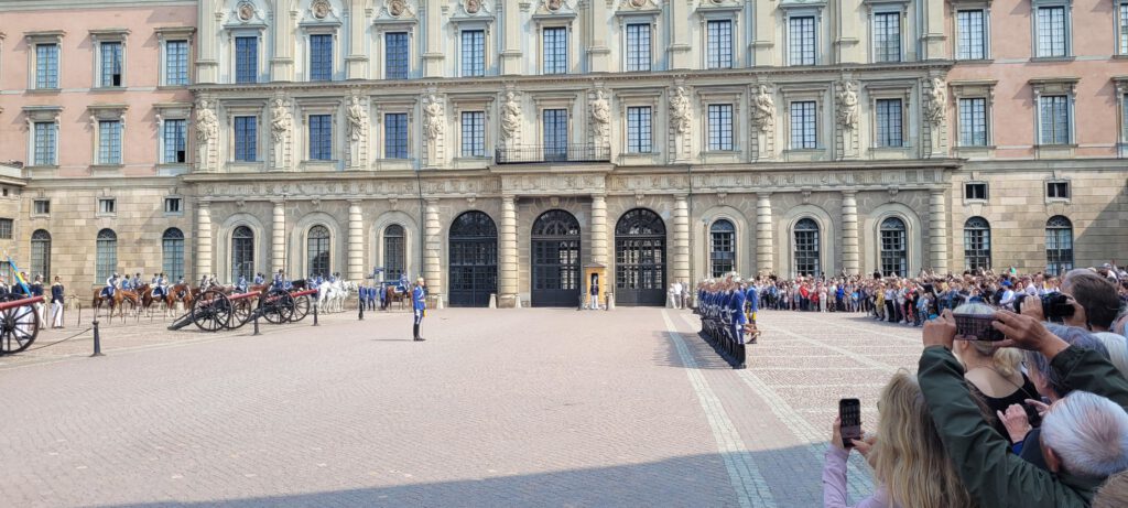 Nachdem die Wachführer ein paarmal die Nationalflagge hin und her geschwenkt und über den Platz getragen, die Wachmannschaften ihre Plätze getauscht und die Musiker dazu gespielt haben, gehört der Platz komplett dem berittenen Orchester, das jetzt, in Formation reitend, Märsche, Operettenmelodien und, ja tatsächlich ein ABBA-Medley darbietet (bei dem übrigens alle Pferde ganz entspannt still stehen – die Musik mögen sie offensichtlich).