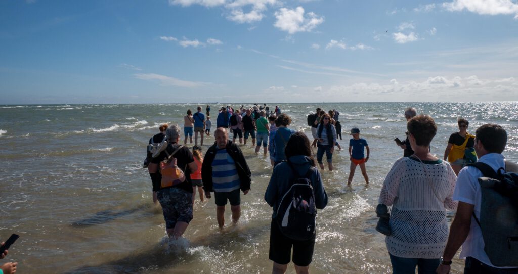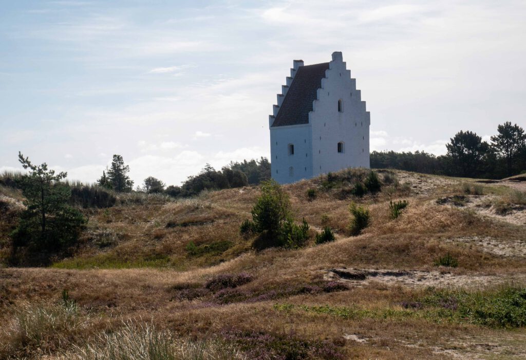Heute also Skagen. Zunächst die versandete Kirche, von der nur noch die Hälfte des ursprünglichen Turmes zu sehen ist und dann Grenen, wo Skagerak auf Kattegat trifft und die beiden mit etwas Glück einen weißen Schaumstrich in Verlängerung der Landzunge ins Wasser zeichnen. Heute nicht, weil kaum Wind und Wellen da sind. Trotzdem reicht es für eine klatschnasse Hose, wenn man gerade mit dem einen Fuß in der Nordsee und mit dem anderen in der Ostsee steht – so wie ich…
